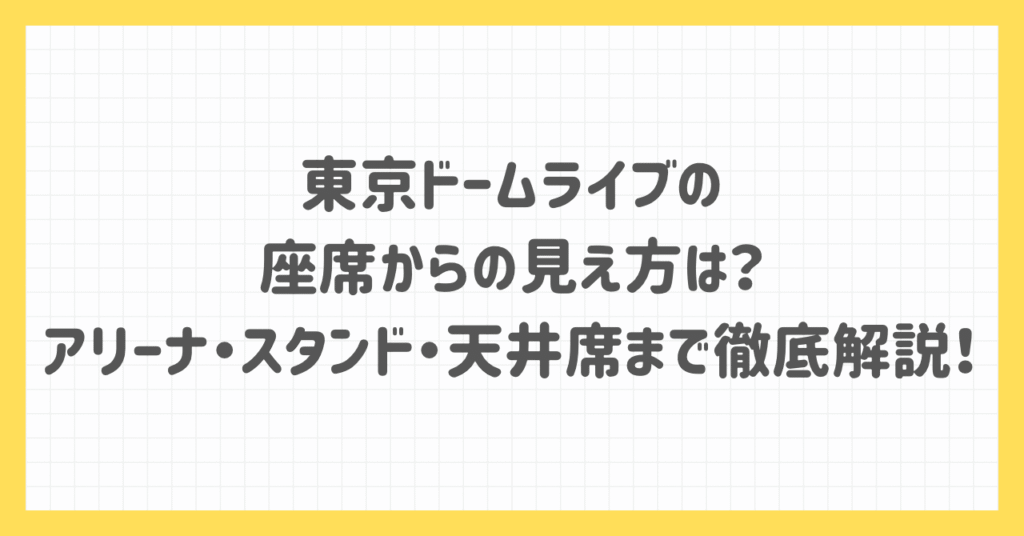 東京ドームで開催されるライブに申し込みをする際や当たったタイミングで、「東京ドームのライブって、どの席が一番見やすいの?」「アリーナ席・スタンド席・天井席だと見え方はどう違うの?」などといった疑問を持つ人も多いですよね。 東京ドームは、収... -