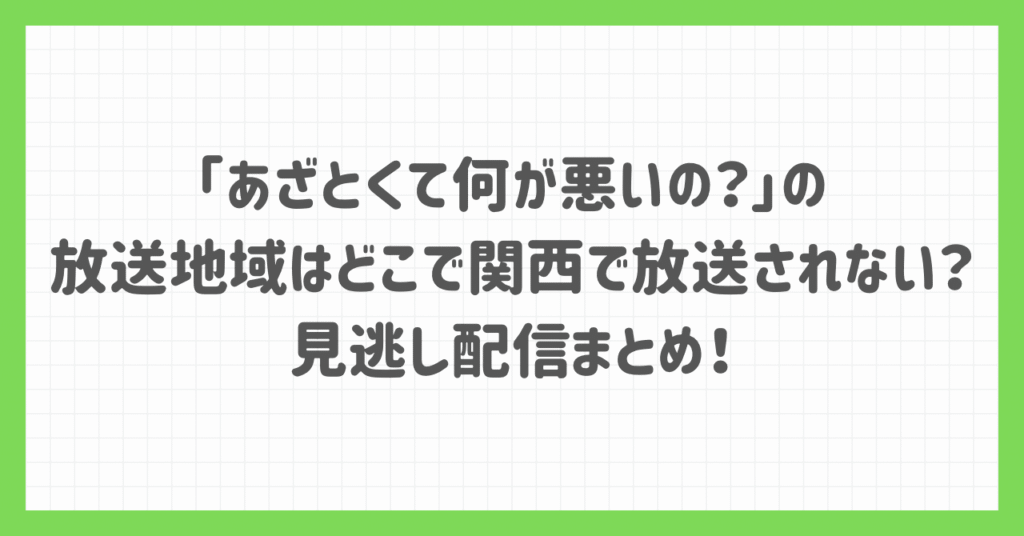 テレビ朝日系で放送されているバラエティ番組「あざとくて何が悪いの?」は、恋愛トークや「あざとい行動」を深掘りする番組として人気です。 そんな「あざとくて何が悪いの?」ですが、「自分の地域では地上波で見れる?」「関西・北海道は放送あるの?」... -