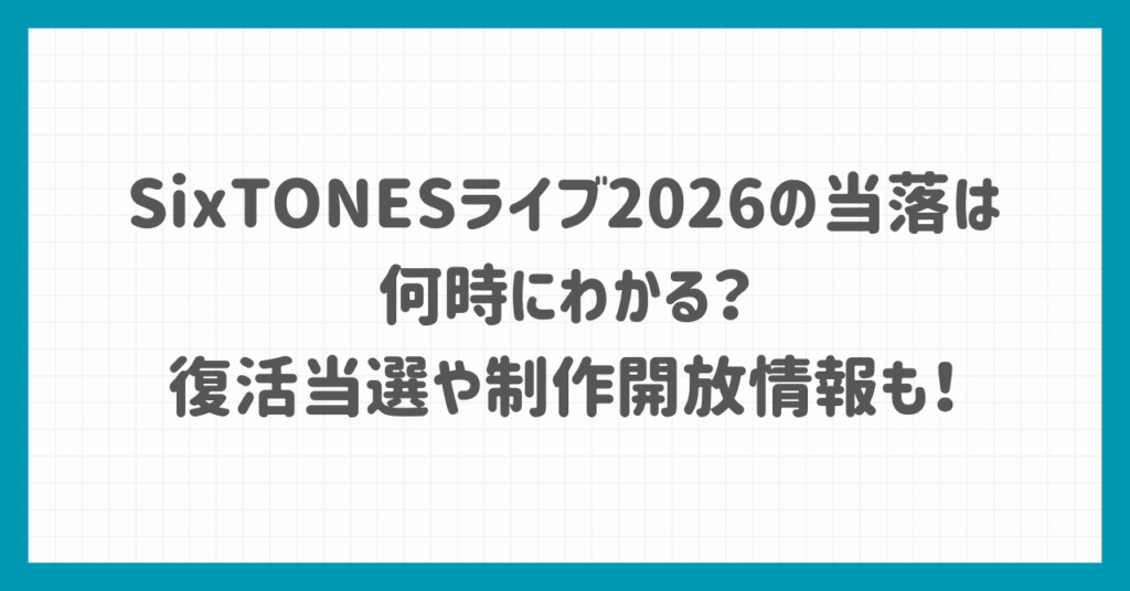 SixTONESが「MILESixTONES(SixTONESライブ2026)」を開催することを発表しています。 SixTONESライブ2026に申し込んだ人は、当落は何時にわかるのか気になっている人もいますよね。 また、万が一落選してしまっても復活当選や制作開放席の案内もあります... -