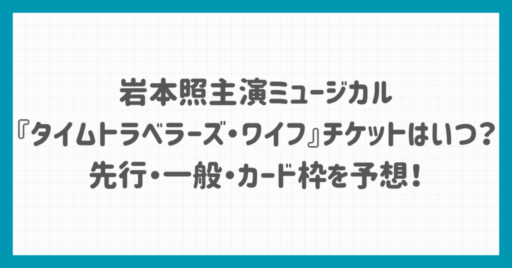 Snow Manの岩本照さんが出演するミュージカル「タイムトラベラーズ・ワイフ」が上演されることが発表されました。 現時点では、公演日程やチケット販売に関する公式な詳細発表はまだ行われていませんが、すでにチケットの取り方や先行販売について気になっ... -