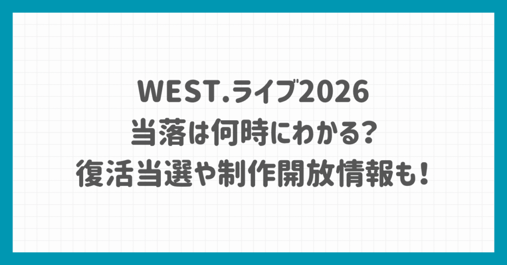 WEST.が「WEST. LIVE TOUR 2026 唯一無二(WEST.ライブ2026)」を開催することを発表しています。 WEST.ライブ2026に申し込んだ人は、当落は何時にわかるのか気になっている人もいますよね。 また、万が一落選してしまっても復活当選や制作開放席の案内も... -