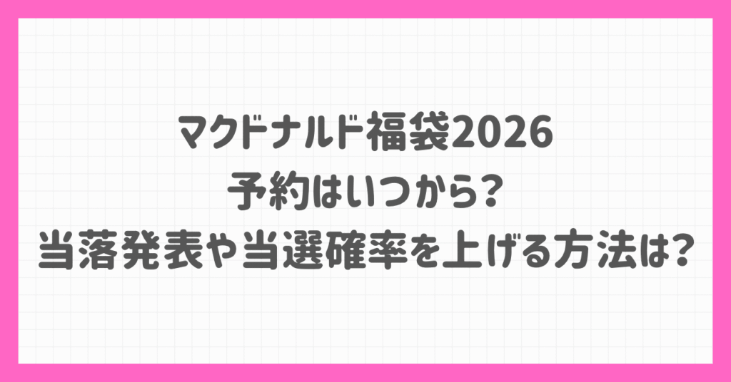 年末になってくると福袋の時期がやってきますが、毎年マクドナルド福袋は人気商品ですよね。 そんなマクドナルド福袋2026の予約はいつからになるのでしょうか? マクドナルド福袋2026を予約したら当落発表はいつなのか、当選確率を上げる方法も知りたいで... -