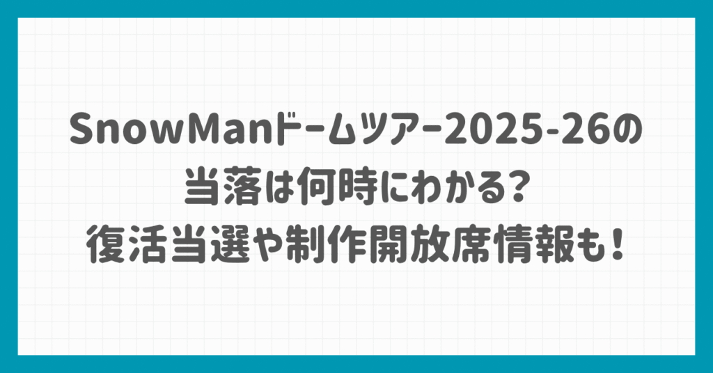 Snow Manが開催する待望のドームツアー 「Snow Man Dome Tour 2025-2026 ON」(SnowManドームツアー2025-26)ですが、申し込んだ人は当落発表の時間が気になりますよね。 万が一落選してしまっても復活当選や制作開放席の案内もありますが、どうなっている... -