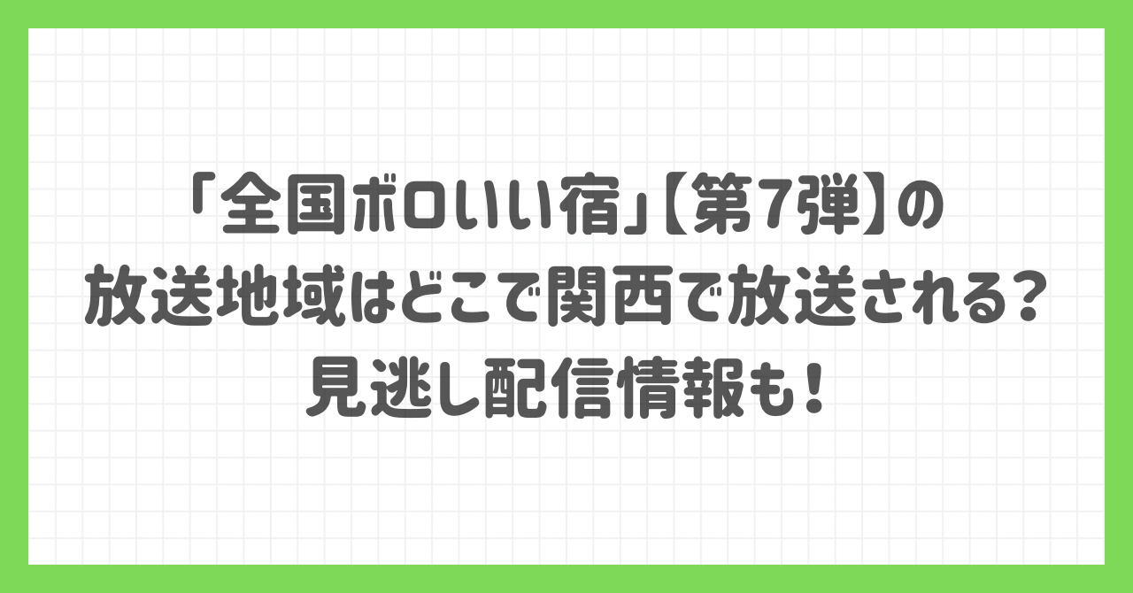 この記事では、「全国ボロいい宿」【第7弾】の放送日程、放送地域(関西では見られるのか)、TVerやU-NEXTでの配信情報をわかりやすくまとめました。