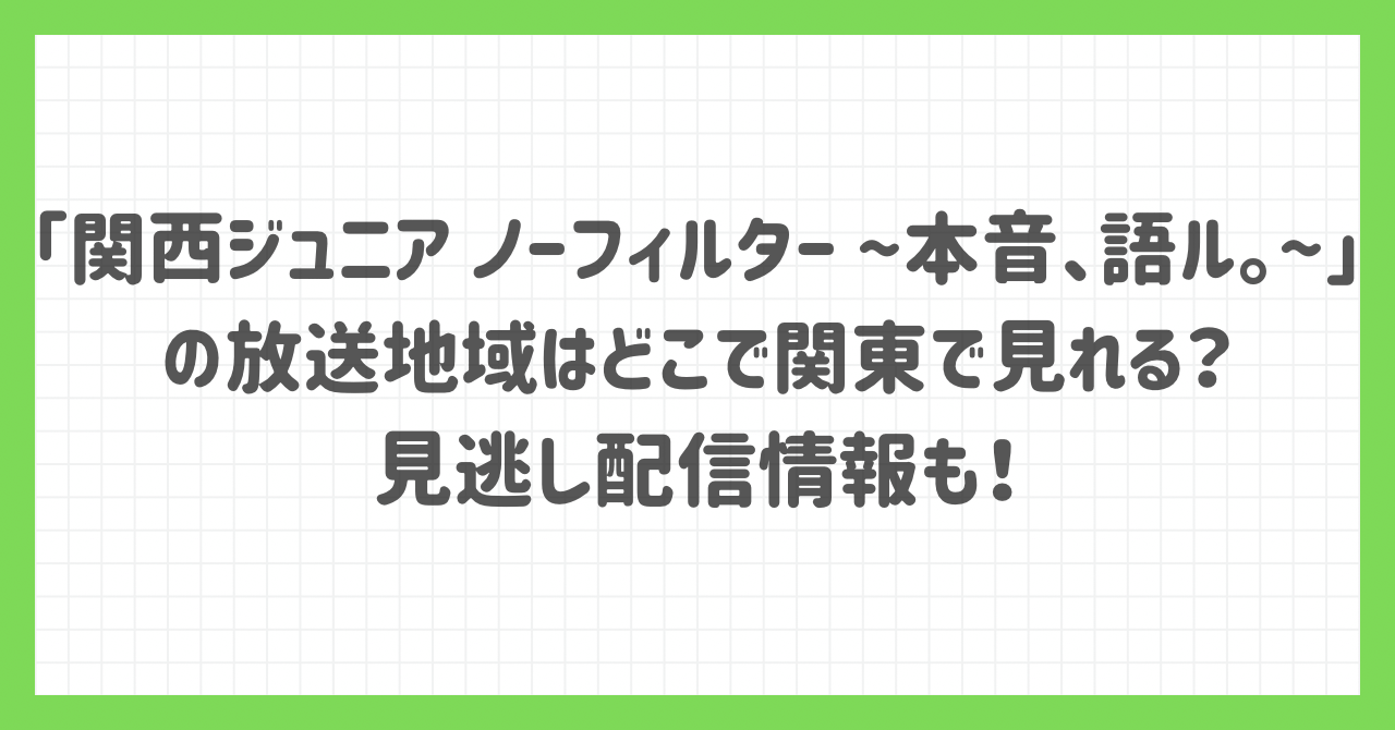 この記事では、「関西ジュニア ノーフィルター ~本音、語ル。~」の放送日程や放送地域(関東でも見られるのか)、TVerでの見逃し配信情報についてわかりやすくまとめました。
