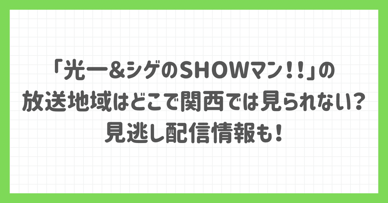 「光一&シゲのSHOWマン‼︎」は「一部地域を除く」と案内されているため、放送地域外の方は特に見逃し配信の有無が気になりますよね。