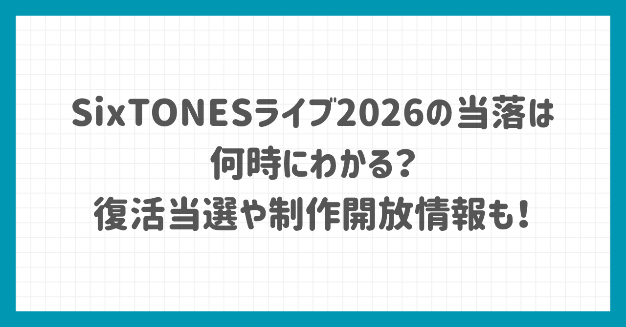 そのため、2026年のSixTONESもドーム規模でのツアーが開催される可能性は高く、開催時期・会場・チケット日程の予想に注目が集まっています。
