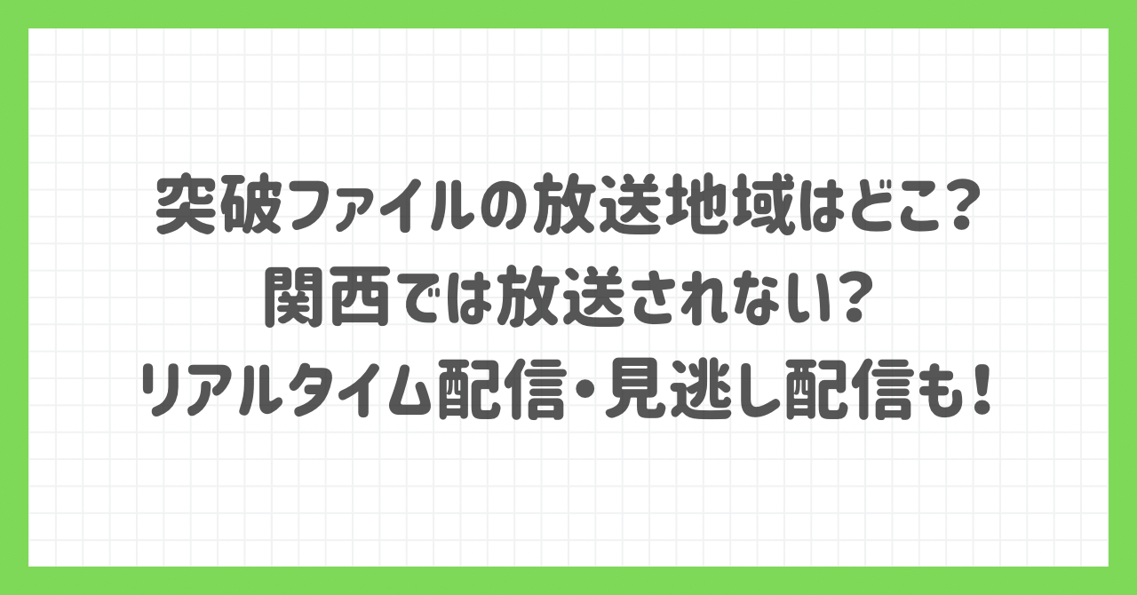そこでこの記事では、「突破ファイル」の放送地域はどこなのか、関西など地方での放送有無、リアルタイム配信や見逃し配信情報について紹介します。