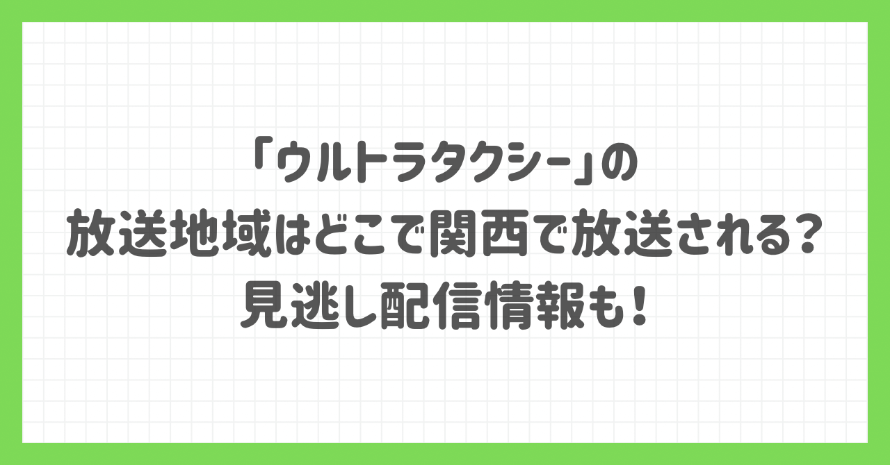 「ウルトラタクシー」は、TBS系列で放送されており、関西ではMBS毎日放送で放送されるため、関西(大阪・京都・兵庫・奈良・滋賀・和歌山)でも問題なく視聴可能です。